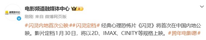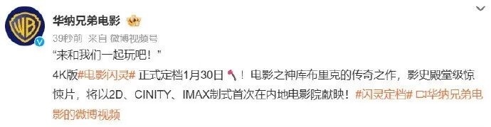 1月14日,据白鹿视频:据@华纳兄弟电影:4K版电影《闪灵》正式定档1月30日,将以2D、IMAX、CINITY等规格上映。